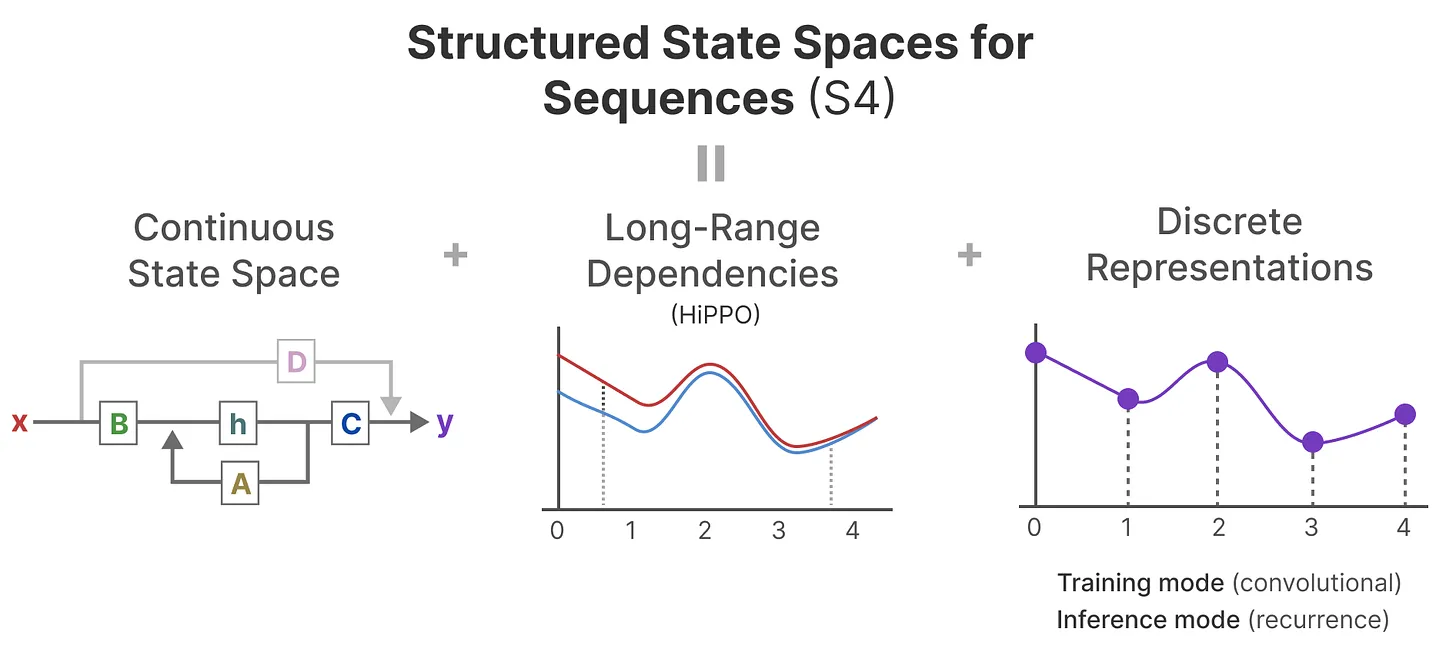 S4全称是Structured State Spaces for Sequence Modeling,用于序列建模的结构化状态空间,是一种针对序列建模的高效模型。S4基于有选择性的SSM(关于有选择性的概念我在下面介绍),也就是说S4是SSM的一种具体实现。结合刚刚的分析来看,S4其实就是将HiPPO应用到上文提的卷积和循环表示,用来处理长距离依赖关系。由三部分组成: