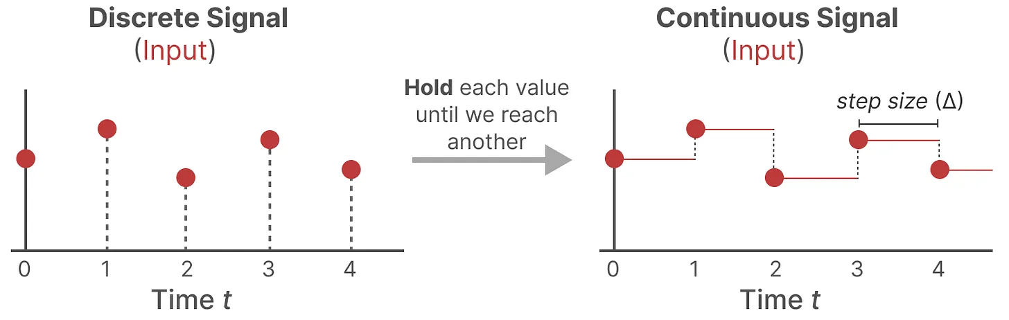 通过连续信号去计算状态是有一定的难度的,而通常我们的输入是离散的,所以我们需要将模型就行离散化。为了实现离散化,使用了一个叫 Zero-order hold 的技术,工作流程大概是这样的:每当接收到离散信号,先保留其值,直到收到新的离散信号,这样的话,使得SSM可以使用连续信号,示意图如下: