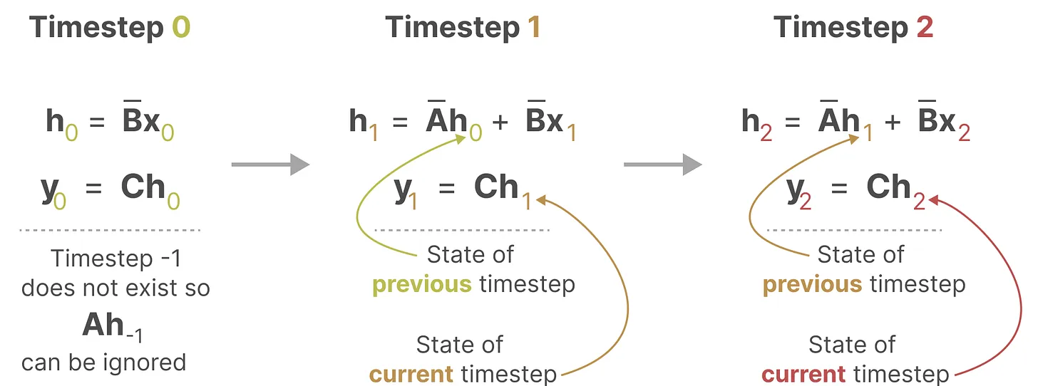 离散化 SSM 使我们能够以特定的时间步长而不是连续信号来处理问题,这一点类似于我们前面讲过的循环神经网络RNN,循环方法在这里也适用,在每个时间步,我们计算当前输入$Bx_{k}$如何影响之前的状态$Ah_{k-1}$,然后计算预测输出$Ch_{k}$,计算过程如下: