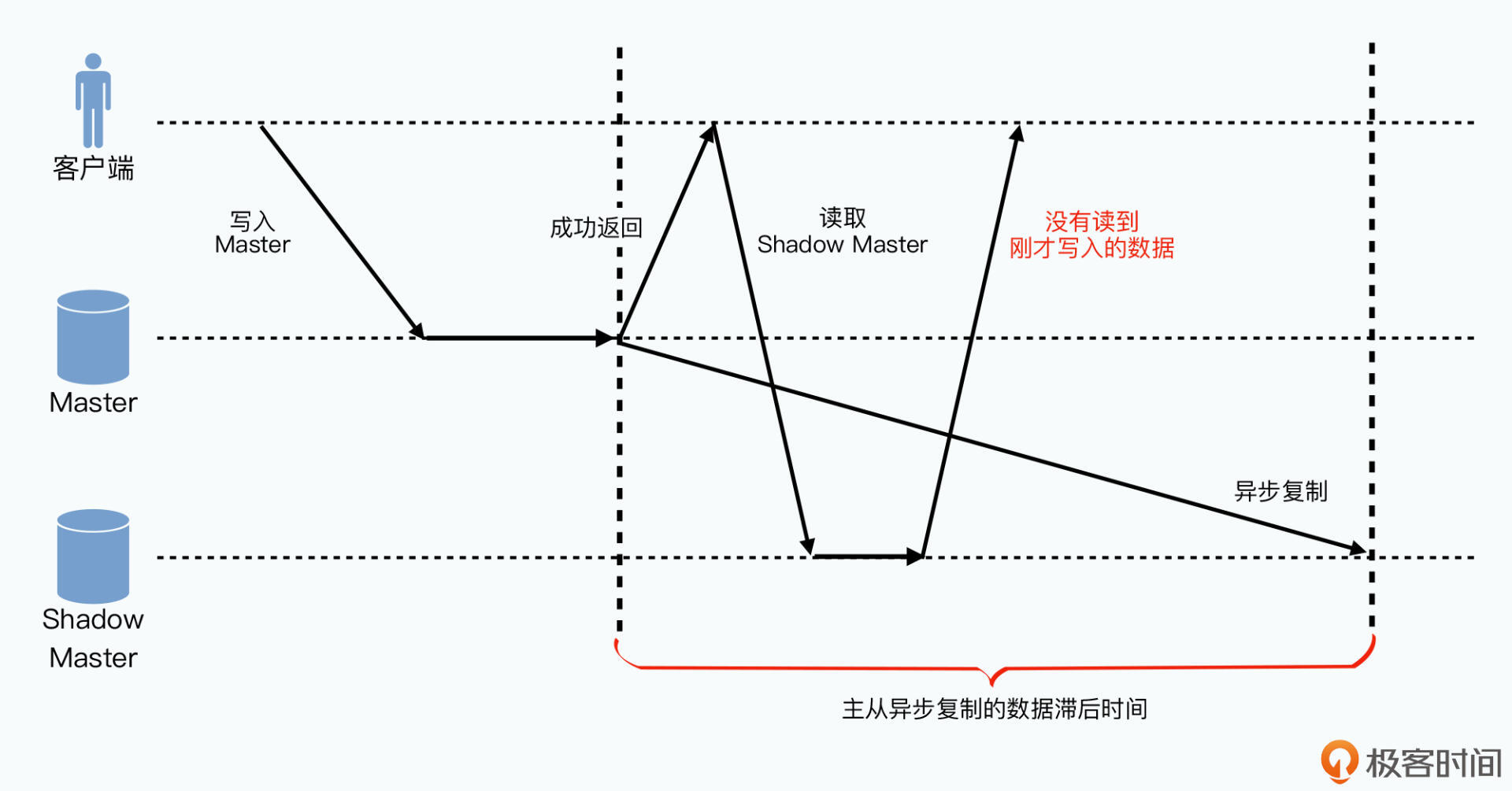 - 客户端只能从Shadow Master读取数据,刚刚写入的数据并没有被读到。