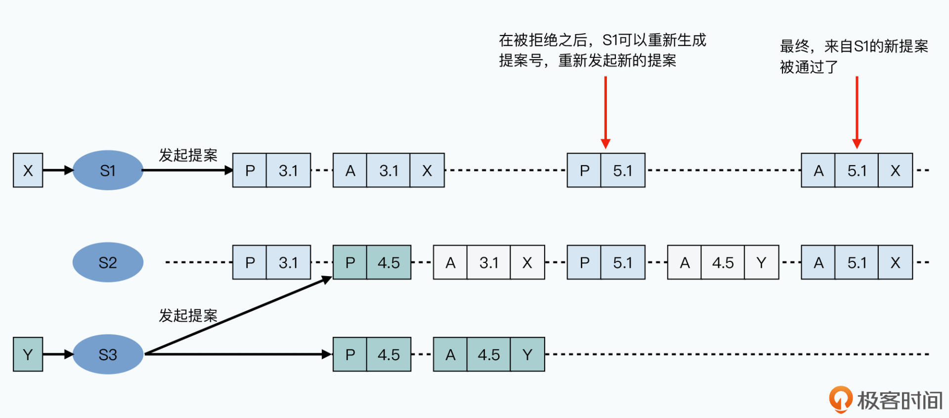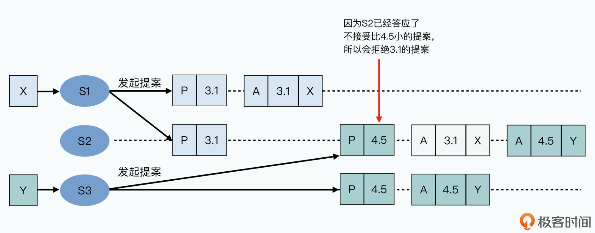 - 但也有可能,接受者刚才已经答应了某个新的提案者说,不能接受一个比提案号N早的请求。而N>M,所以这个时候接受者会拒绝M。