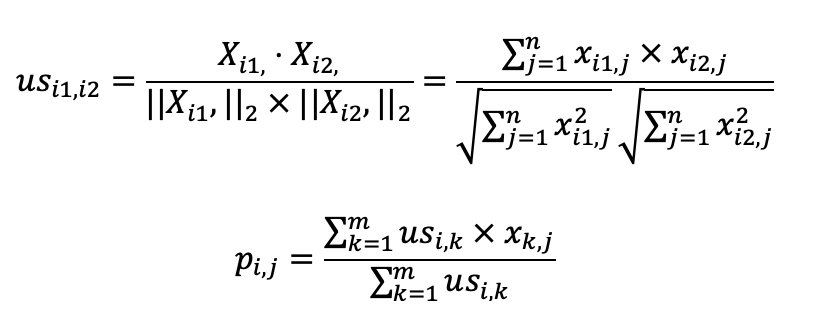 第二个公式利用第一个公式所计算的用户间相似度,以及用户对物品的喜好度,预测任一个用户对任一个物品的喜好度。其中$p_{i,j}$表示第$i$用户对第$j$个物品的喜好度,$us_{i,k}$表示用户$i$和$k$之间的相似度,$x_{k,j}$表示用户$k$对物品$j$的喜好度。注意这里最终需要除以$Σus_{i,k}$,是为了进行归一化。
