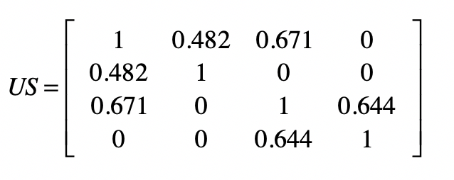 明白了上面这个对应关系,我们就可以利用矩阵$Y$,获得任意两个用户之间的相似度,并得到一个m×m维的相似度矩阵$US$。矩阵$US$中$us_{i,j}$的取值为第$i$个用户与第$j$个用户的相似度。这个矩阵是一个沿对角线对称的矩阵。根据夹角余弦的定义,$us_{i,j}$和$us_{j,i}$是相等的。通过示例的矩阵$Y$,我们可以计算矩阵$US$。我把相应的结果列在了下方。