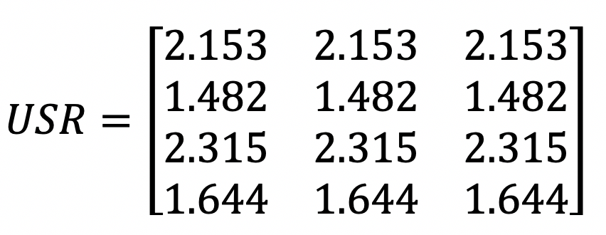 为了实现上面这个公式的分子部分,我们可以使用$US$和$X$的点乘。我们假设点乘后的结果矩阵为$USP$。这里我列出了根据示例计算得到的矩阵$USP$。