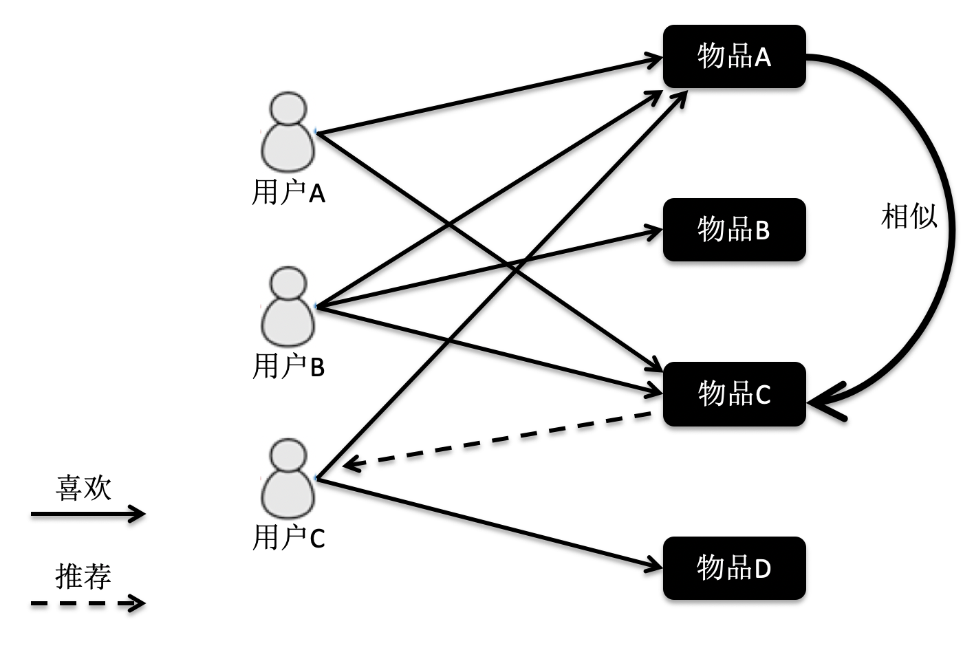 在这张图中,物品A和C因为都被用户A和B同时访问,因此它们被认为相似度更高。当用户C访问过物品A后,系统会更多地向用户推荐物品C,而不是其他物品。