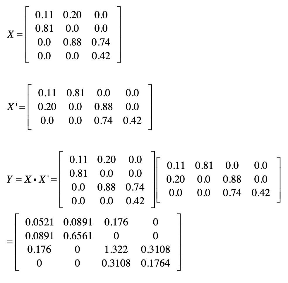 在介绍向量空间模型的时候,我提到夹角余弦可以通过向量的点乘来实现。这对矩阵同样适用,我们可以采用矩阵点乘自身的转置来实现,也就是$XX’$。矩阵$X$的每一行是某个用户的行向量,每个分量表示用户对某个物品的喜好程度。而矩阵$X’$的每一列是某个用户的列向量,每个分量表示用户对某个物品的喜好程度。