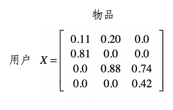 其中第$i$行是第$i$个用户的数据,而第j列是用户对第j个物品的喜好程度。我们用$x_{i,j}$表示这个数值。这里的喜好程度可以是用户购买商品的次数、对书籍的评分等等。