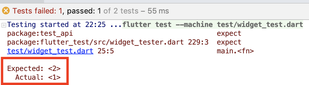 **如果测试用例的执行结果是不通过,Flutter会给我们怎样的提示呢?**我们试着修改一下第一个计数器递增的用例,将它的期望结果改为2: