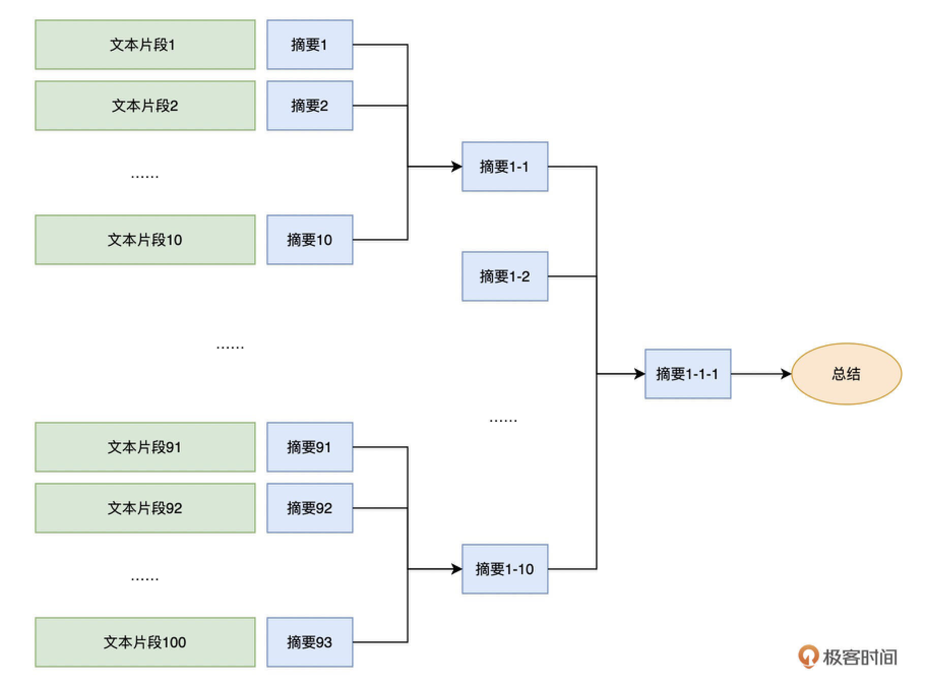 要解决这个问题也并不困难,我们只要进行分段小结,再对总结出来的内容再做一次小结就可以了。我们可以把一篇文章,乃至一本书,构建成一个树状的索引。每一个树里面的节点,就是它的子树下内容的摘要。最后,在整棵树的根节点,得到的就是整篇文章或者整本书的总结了。