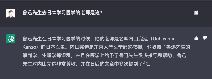 我们先来尝试问ChatGPT一个人尽皆知的常识,“鲁迅先生去日本学习医学的老师是谁”,结果它给出的答案是鲁迅的好友,内山书店的老板内山完造,而不是大家都学习过的藤野先生。
