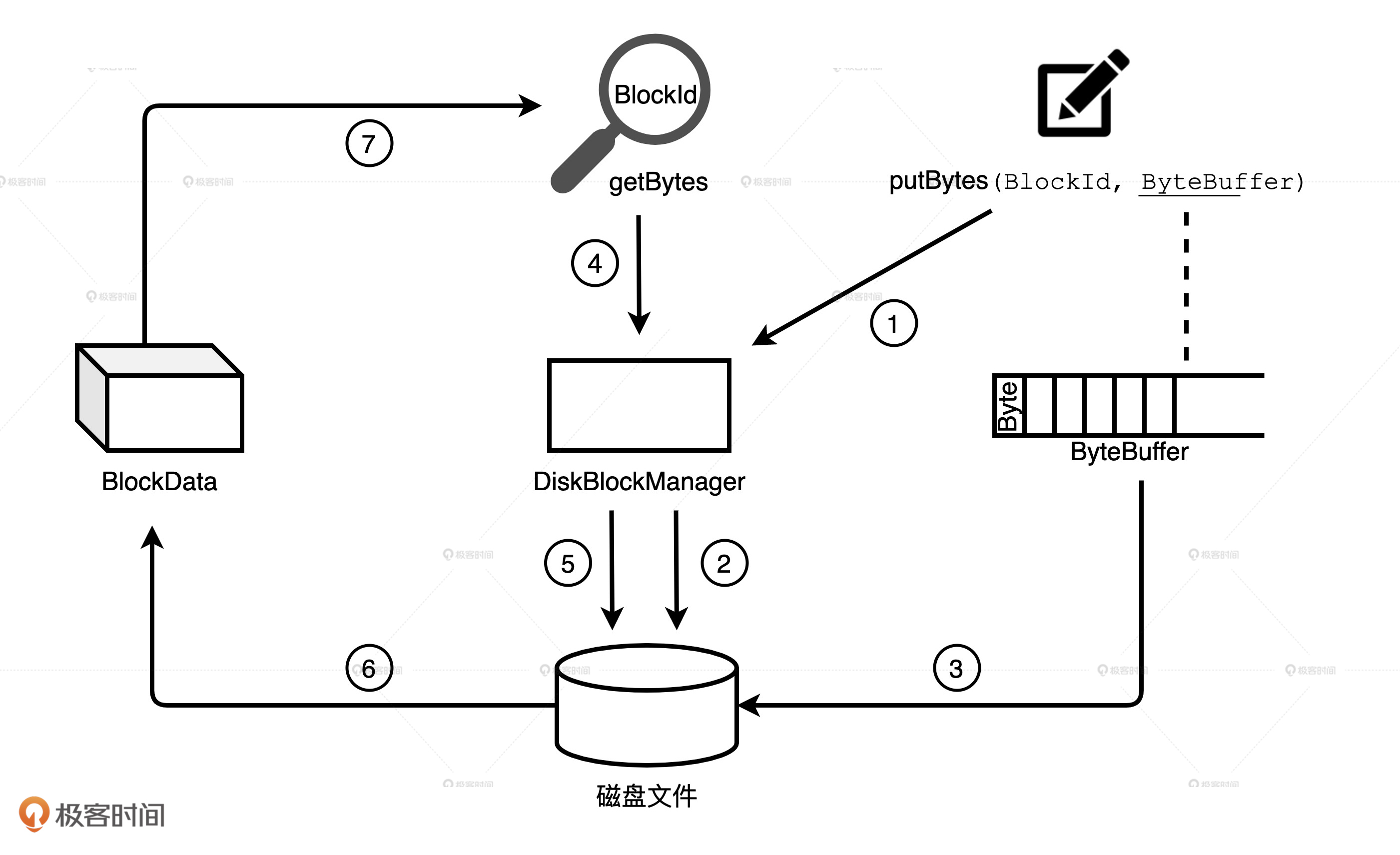 DiskStore则利用DiskBlockManager维护的数据块与磁盘文件的对应关系,来完成字节序列与磁盘文件之间的转换。