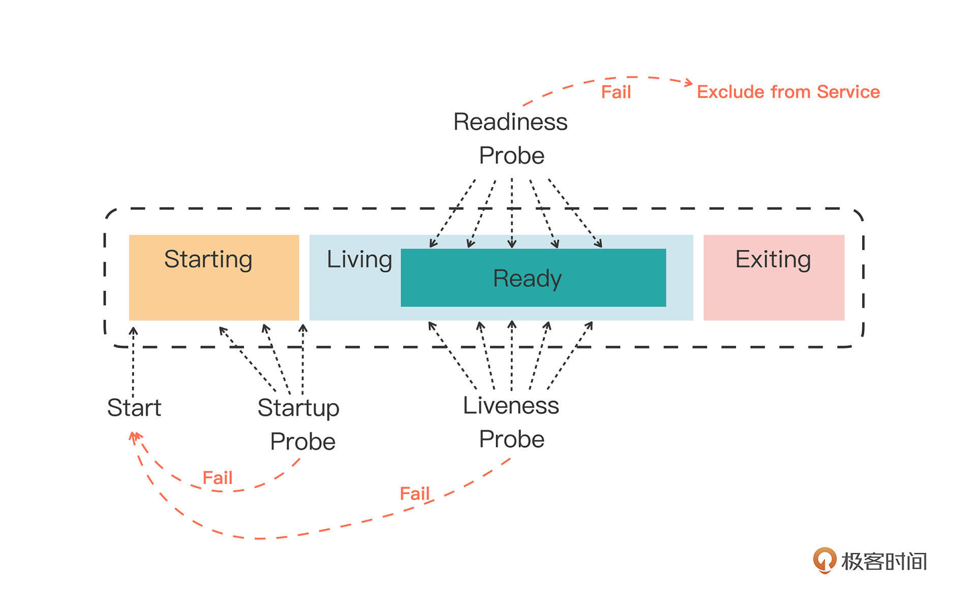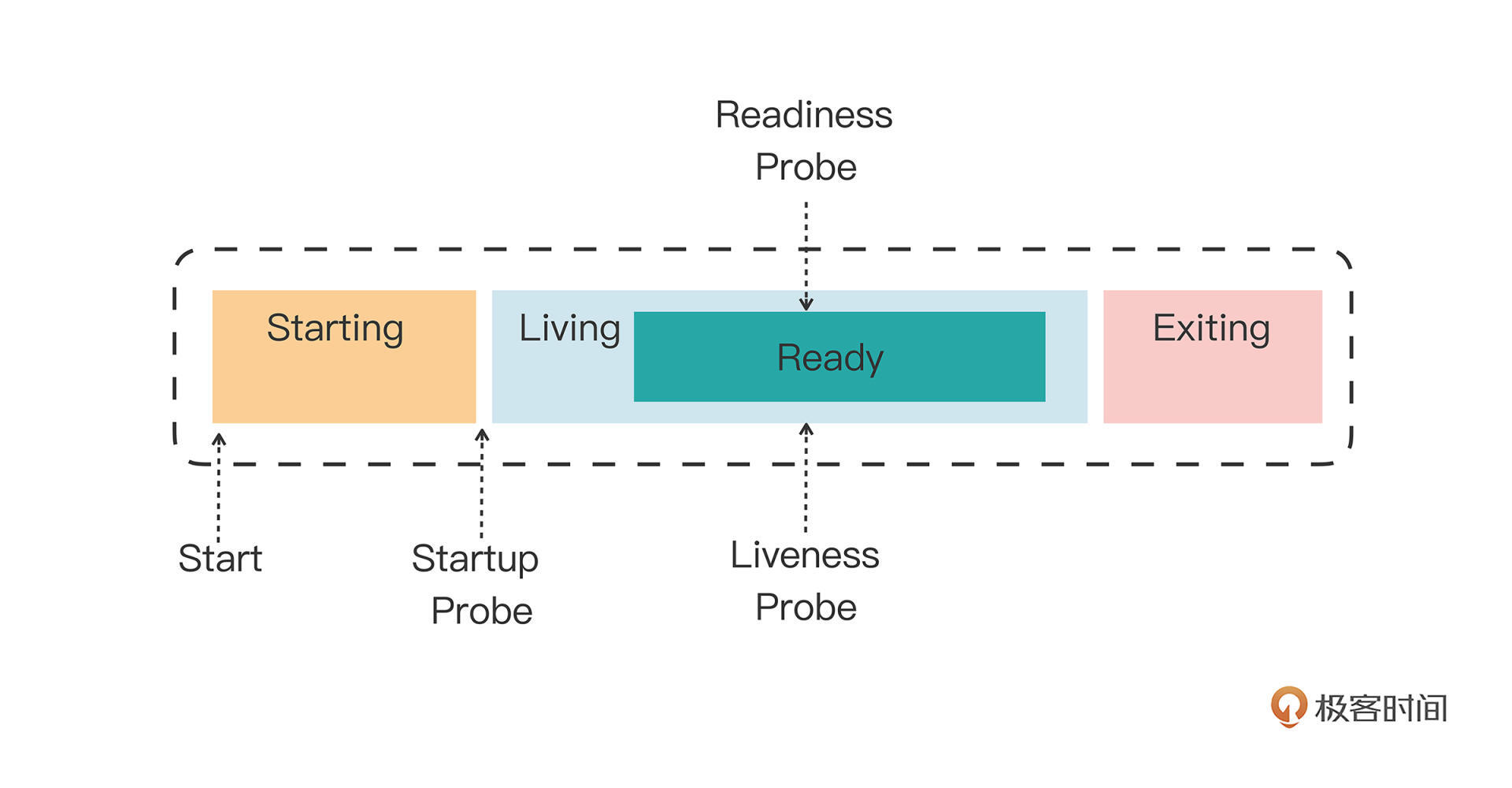 你需要注意这三种探针是递进的关系:应用程序先启动,加载完配置文件等基本的初始化数据就进入了Startup状态,之后如果没有什么异常就是Liveness存活状态,但可能有一些准备工作没有完成,还不一定能对外提供服务,只有到最后的Readiness状态才是一个容器最健康可用的状态。