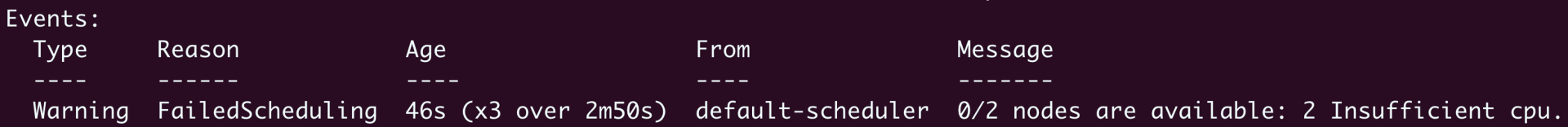 这就很明确地告诉我们Kubernetes调度失败,当前集群里的所有节点都无法运行这个Pod,因为它要求的CPU实在是太多了。