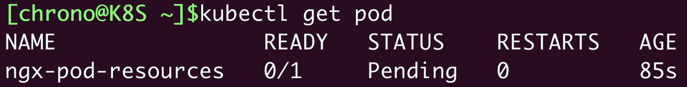 不过我们再用 kubectl get pod 去查看的话,就会发现它处于“Pending”状态,实际上并没有真正被调度运行: