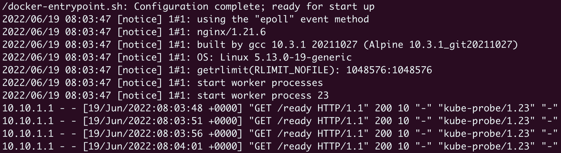 当然,因为这个Nginx应用非常简单,它启动后探针的检查都会是正常的,你可以用 kubectl logs 来查看Nginx的访问日志,里面会记录HTTP GET探针的执行情况: