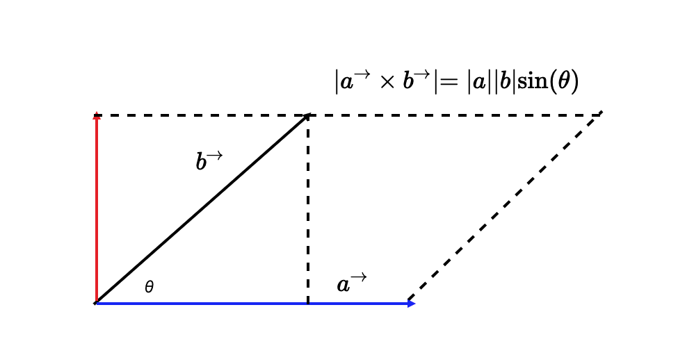 以二维空间为例,向量a和b的叉积,就相当于向量a(蓝色带箭头线段)与向量b沿垂直方向的投影(红色带箭头线段)的乘积。那如下图所示,二维向量叉积的几何意义就是向量a、b组成的平行四边形的面积。