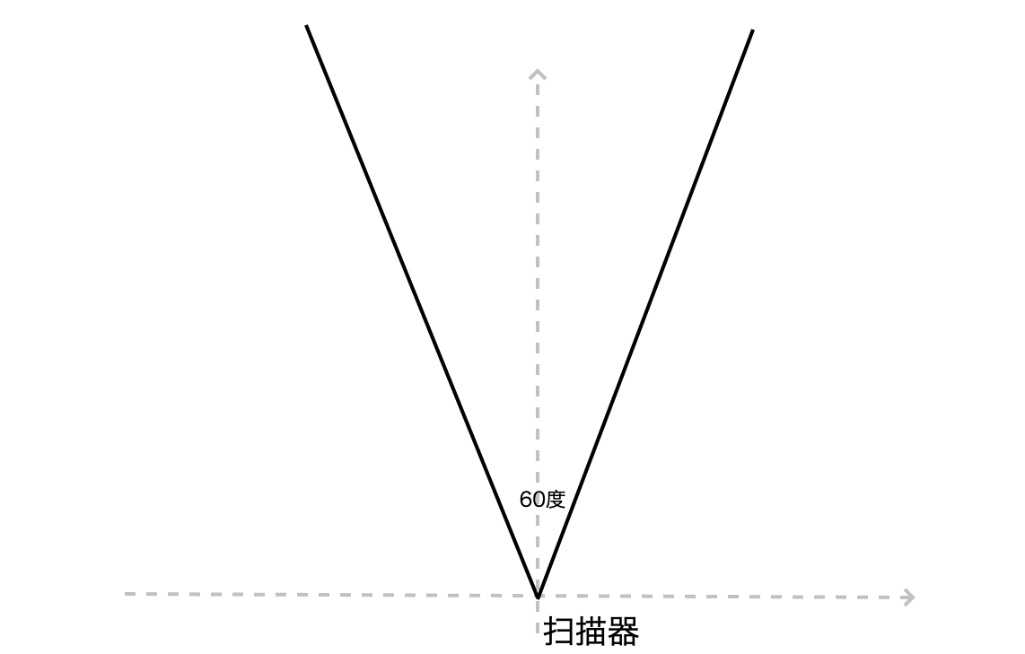 这是一个很简单、直观的解法,但是它不够完美,因为这个判断和扫描器的方向有关。什么意思呢?从上面的图中你可以看到,现在它正对着y轴正方向,所以角度在π/3和2π/3之间。但如果将它的方向旋转,或者允许它朝向任意的方向,我们就必须要修改对应的角度值了。这个时候就会非常麻烦。