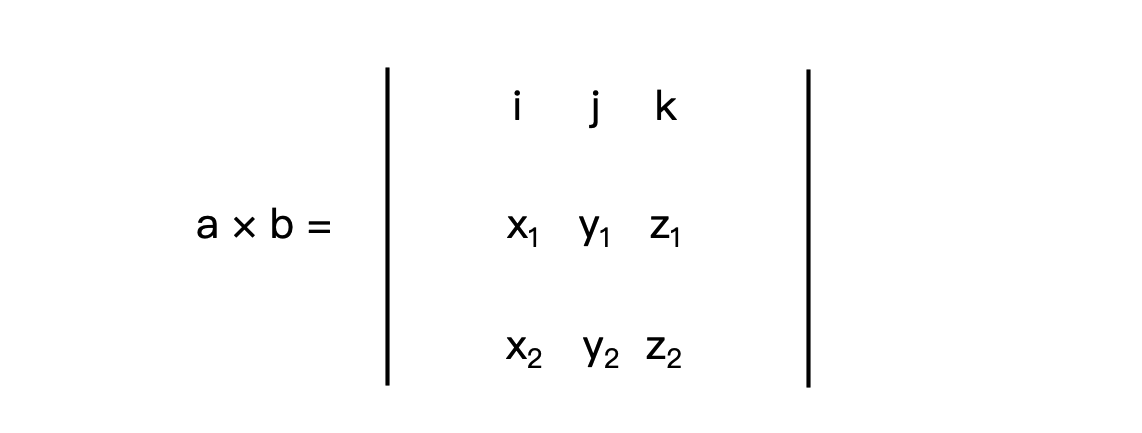 1 | a X b = [y1 * z2 - y2 * z1, - (x1 * z2 - x2 * z1), x1 * y2 - x2 * y1] |