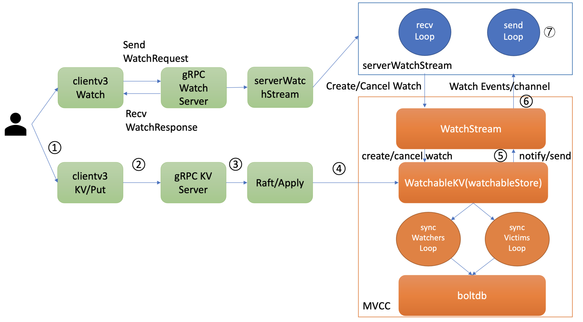 当你通过etcdctl或API发起一个watch key请求的时候,etcd的gRPCWatchServer收到watch请求后,会创建一个serverWatchStream, 它负责接收client的gRPC Stream的create/cancel watcher请求(recvLoop goroutine),并将从MVCC模块接收的Watch事件转发给client(sendLoop goroutine)。