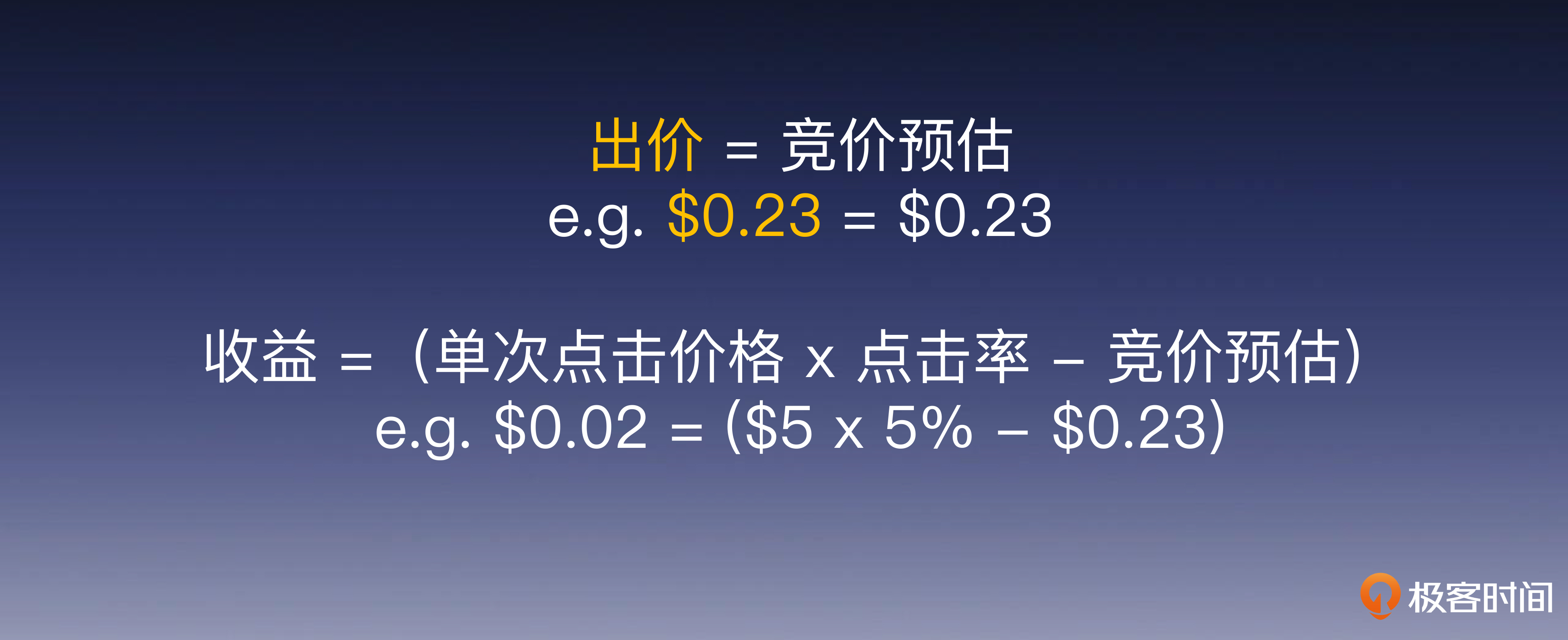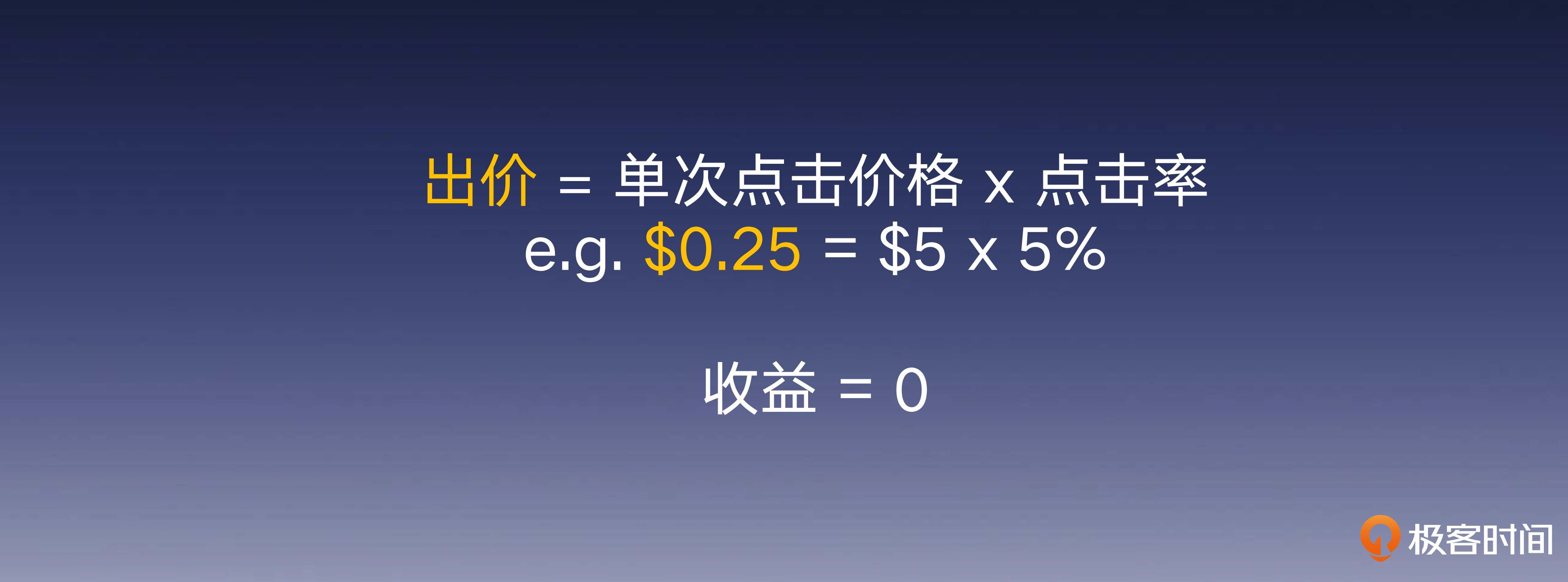 不过真实的场景稍微复杂一些,广告主一般不会直接给出“展示”一次广告的价格,而是通常给出“点击”一次广告的价格,比如一次广告点击就支付 5 美元。