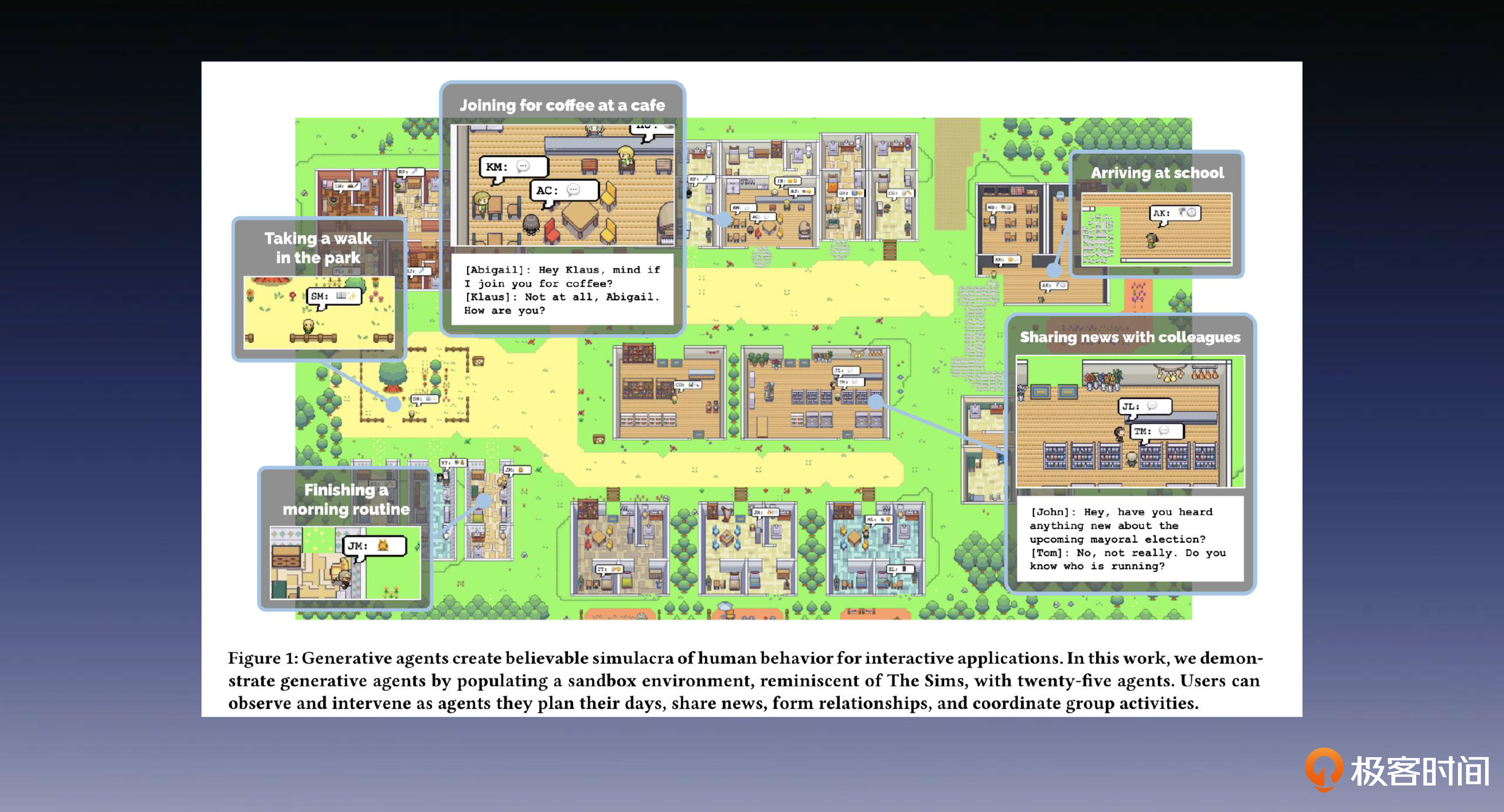 这里为你准备了一张图,它展示了斯坦福提出的AI智能体社会实验,他们用 25 个 ChatGPT 的大语言模型实例,分别扮演虚构城镇中不同的角色,完成了一场有趣的社会实验。学有余力的同学可以先看一下这篇文章。关于具体的多智能体算法,我们后面课程里还会继续讨论。