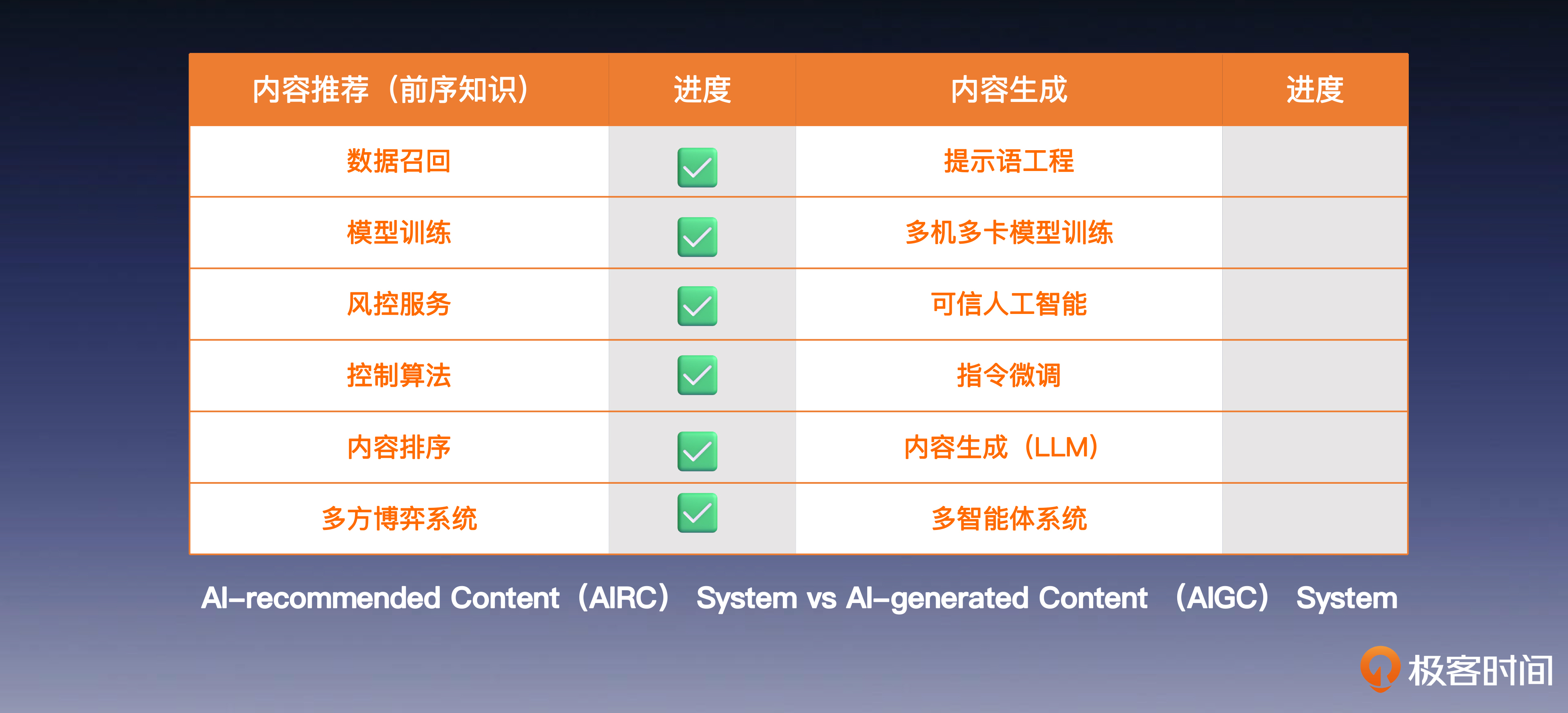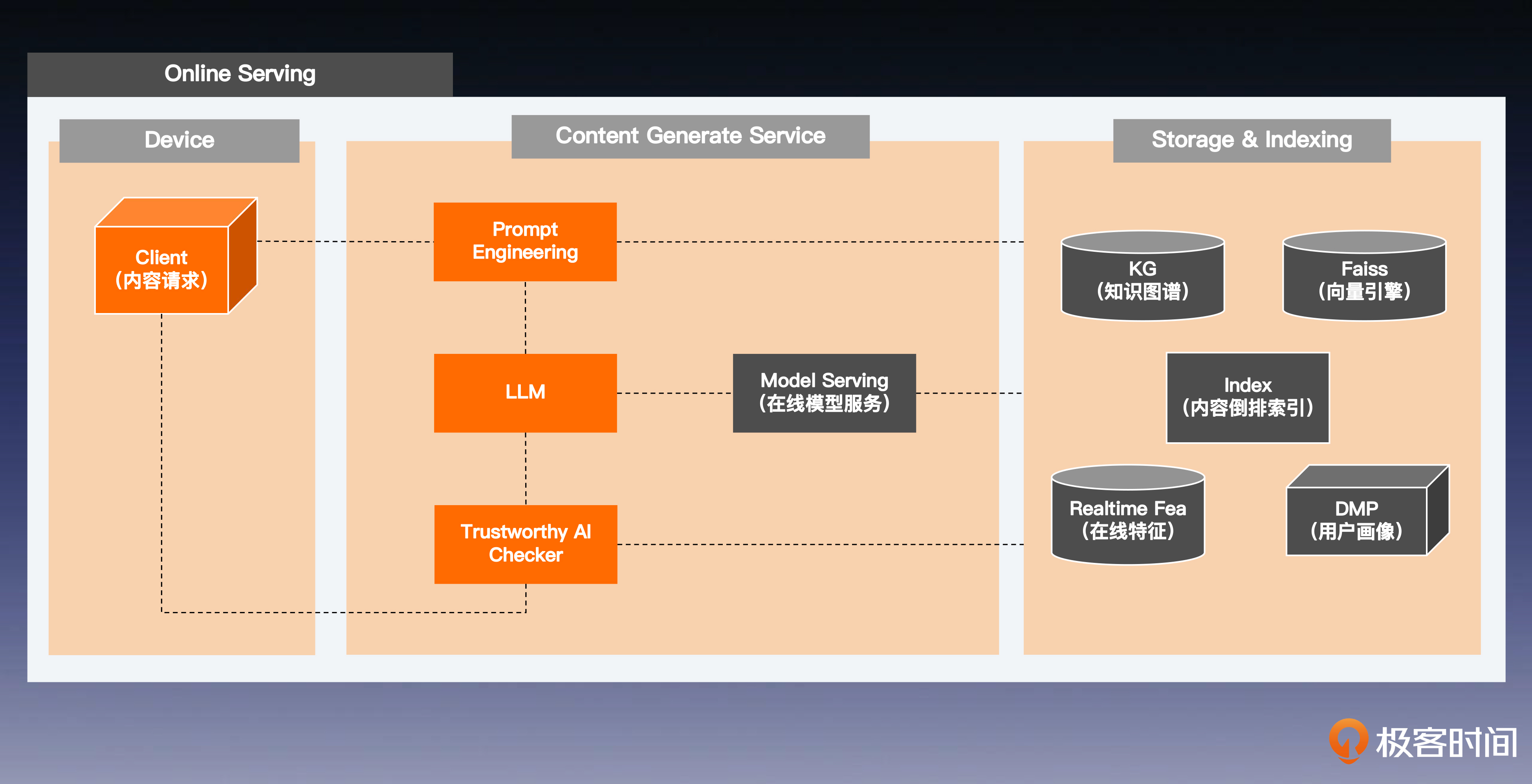 还记得我在上节课开头说的那句话么?“这个架构既可以满足搜索、广告和推荐等经典内容分发场景的需求。也同样能兼容内容生成系统,也就是AIGC的需求。”