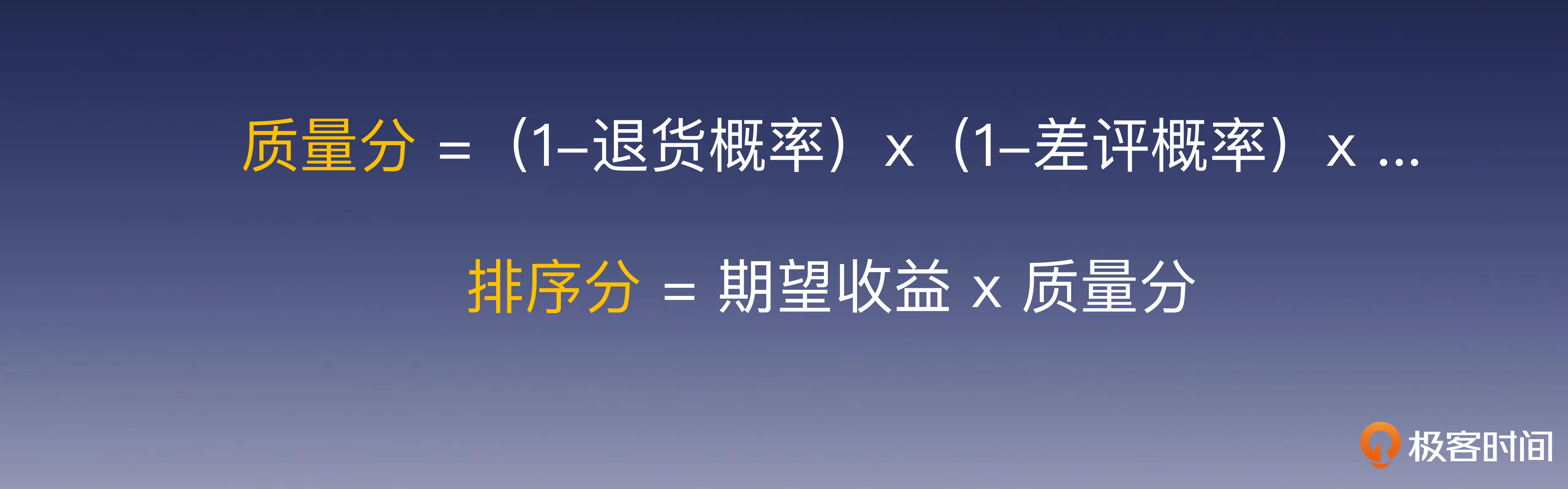 比如你分析数据发现,大部分用户在购买劣质商品后,就不再回到你的平台。这时,你就可以把质量分作为新因子,加入排序分的计算当中。比如使用预测的好评率和退货率来代表质量分,影响排序结果。
