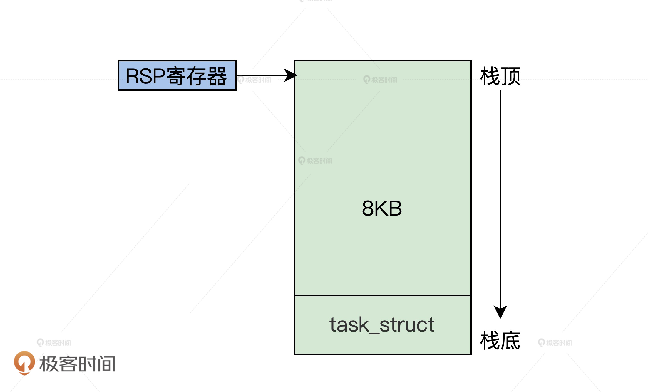 从图中不难发现,Linux把task_struct结构和内核栈放在了一起 ,所以我们只要把RSP寄存器的值读取出来,然后将其低13位清零,就得到了当前task_struct结构体的地址。由于内核栈比较大,而且会向下伸长,覆盖掉task_struct结构体内容的概率就很小。