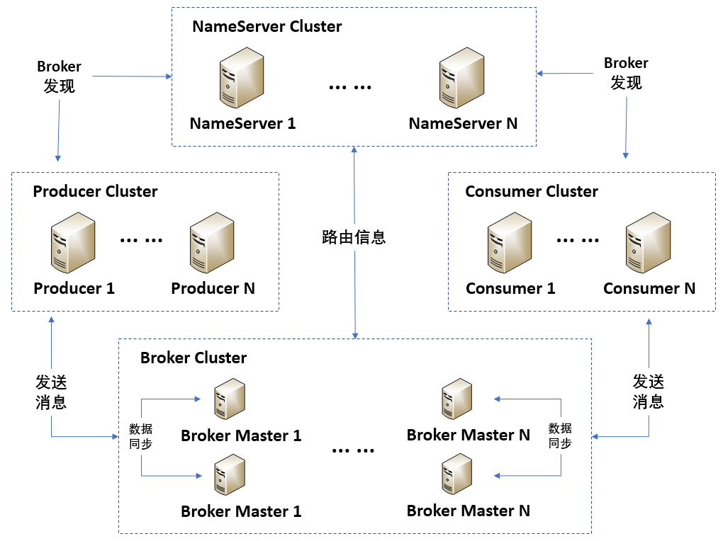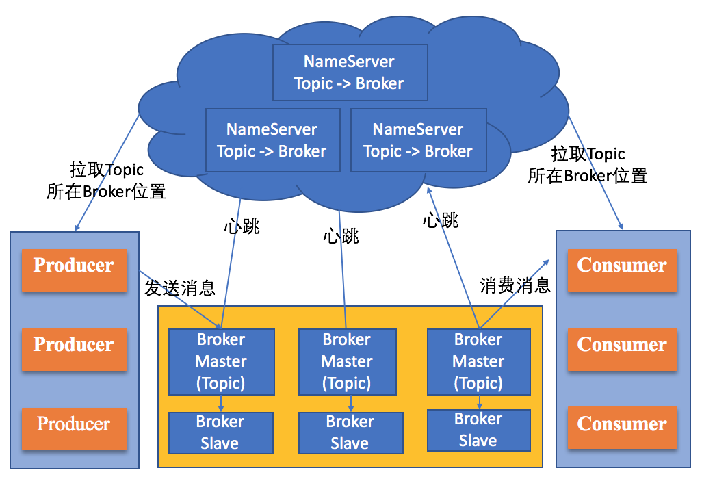 RokcetMQ共包括NameServer Cluster、Producer Cluster、Broker Cluster和Consumer Cluster共4部分。接下来,我们一起看看每部分的具体功能吧。