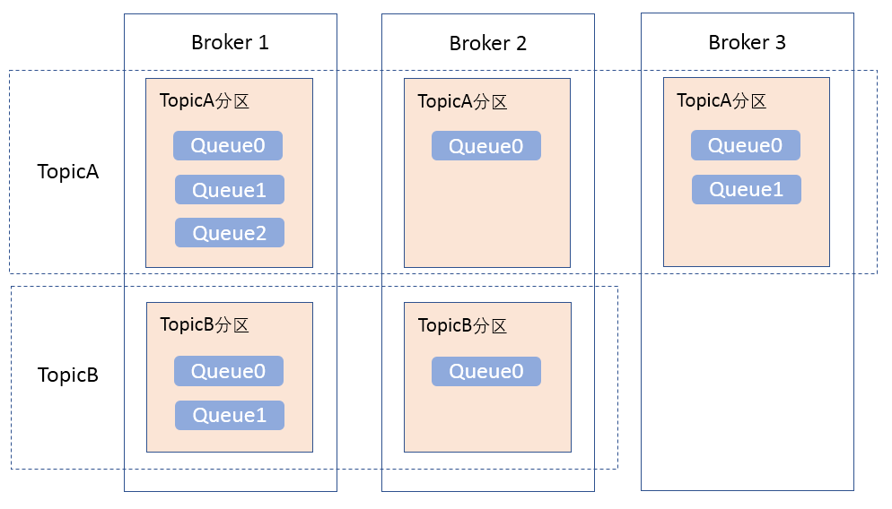 如下图所示,在Broker Cluster中,消息的存储采用主题(Topic)+消息队列(Queue)的方式实现: