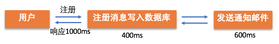 假设,系统将注册信息写入数据库需要花费400ms、给用户发送通知邮件需要花费600ms。