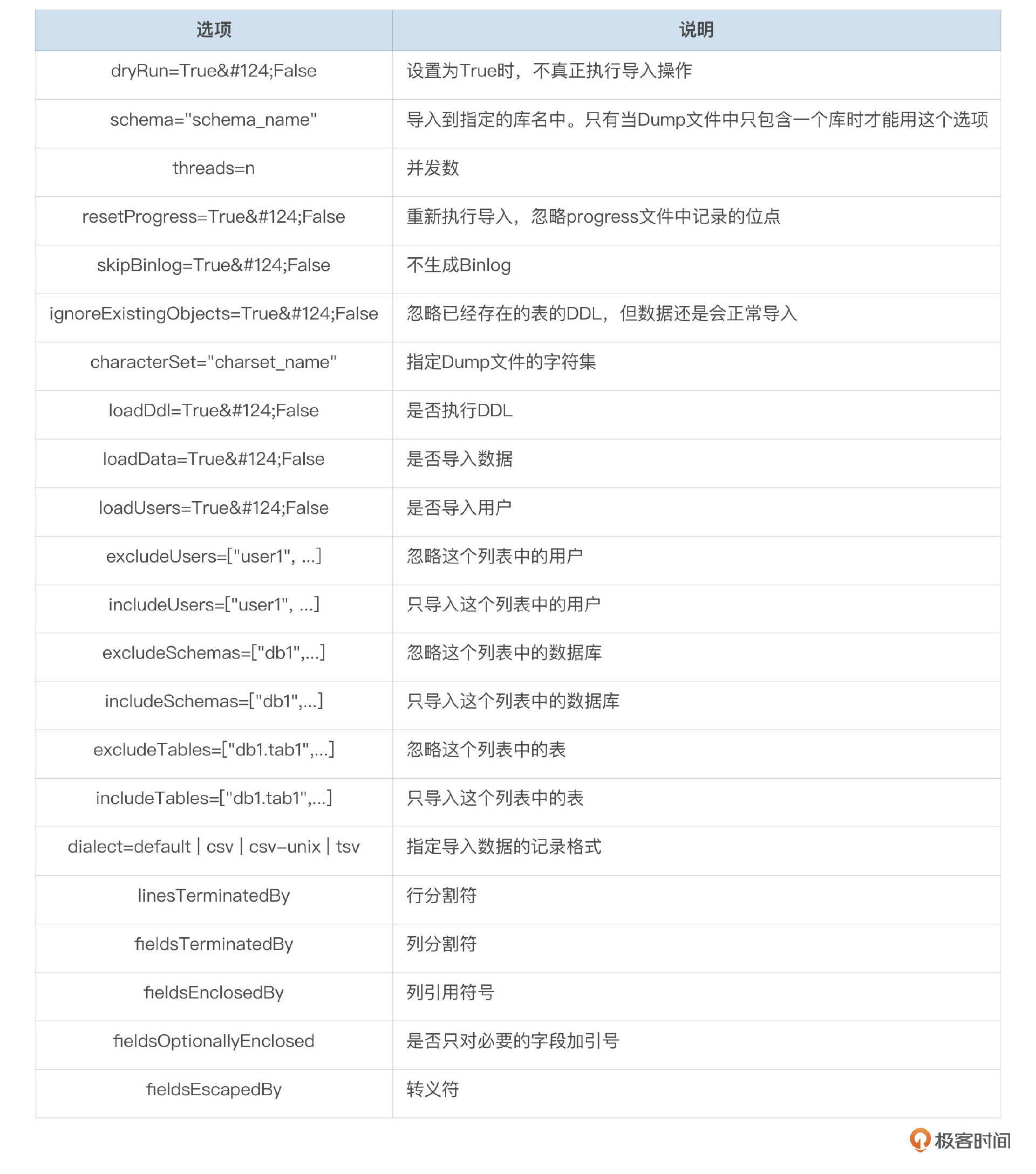 import_table选项 我整理了import_table支持的部分选项,供你参考。完整的选项请参考官方文档 。