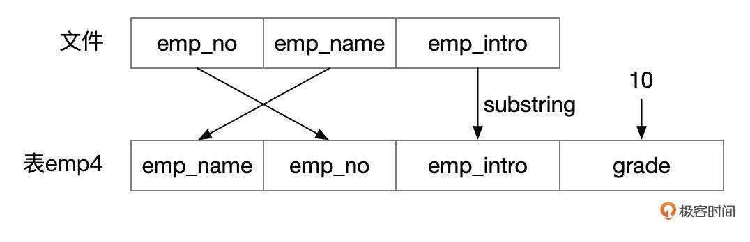 导入数据时,以CSV文件中字段顺序为准,指定字段列表。我们的例子中,第一列对应到emp_no字段,第二列对应到emp_name字段,第三列对应到变量@emp_intro。然后再使用SET,将表的grade字段设置成固定值10,将emp_intro字段设置为文件中emp_intro列的前缀。