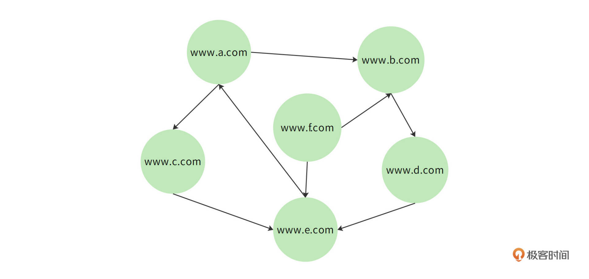 全世界的互联网页面事实上是一个通过超链接连接的巨大网络,其中每个页面都包含一些指向其他页面的URL链接,这些有指向的链接将全部网页构成一个有向(网络)图。如下图所示,每个节点是一个网页,每条有向的边就是一个超链接。