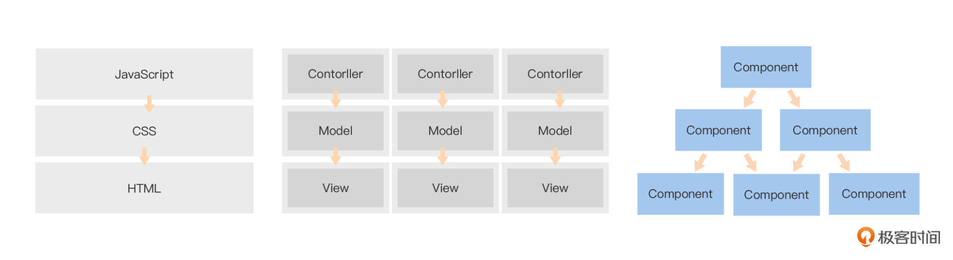 现在,相信你也看到了,把 UI 设计稿拆成完全独立的 HTML/CSS/JavaScript三个部分的这种架构已经不是主流了;2010 年开源的、代表 MVC 架构模式的 AngularJS也被 Angular(v2 及更高版本)这种基于组件的架构模式所代替了;现在 iOS、Android 应用也有很多是基于组件开发的。