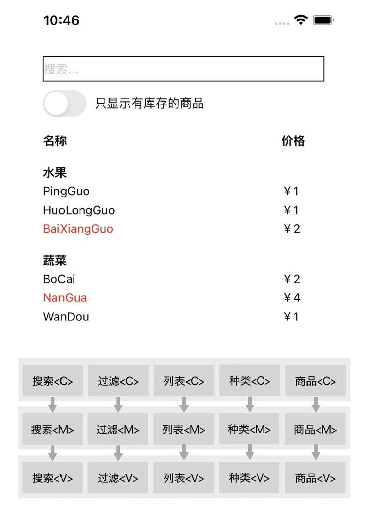 category是“水果”,第二次是“蔬菜”; - Product 组件:它会被 ProductTable 组件调用 6 次,生成 6 个不同的商品元素,展示在手机屏幕上。