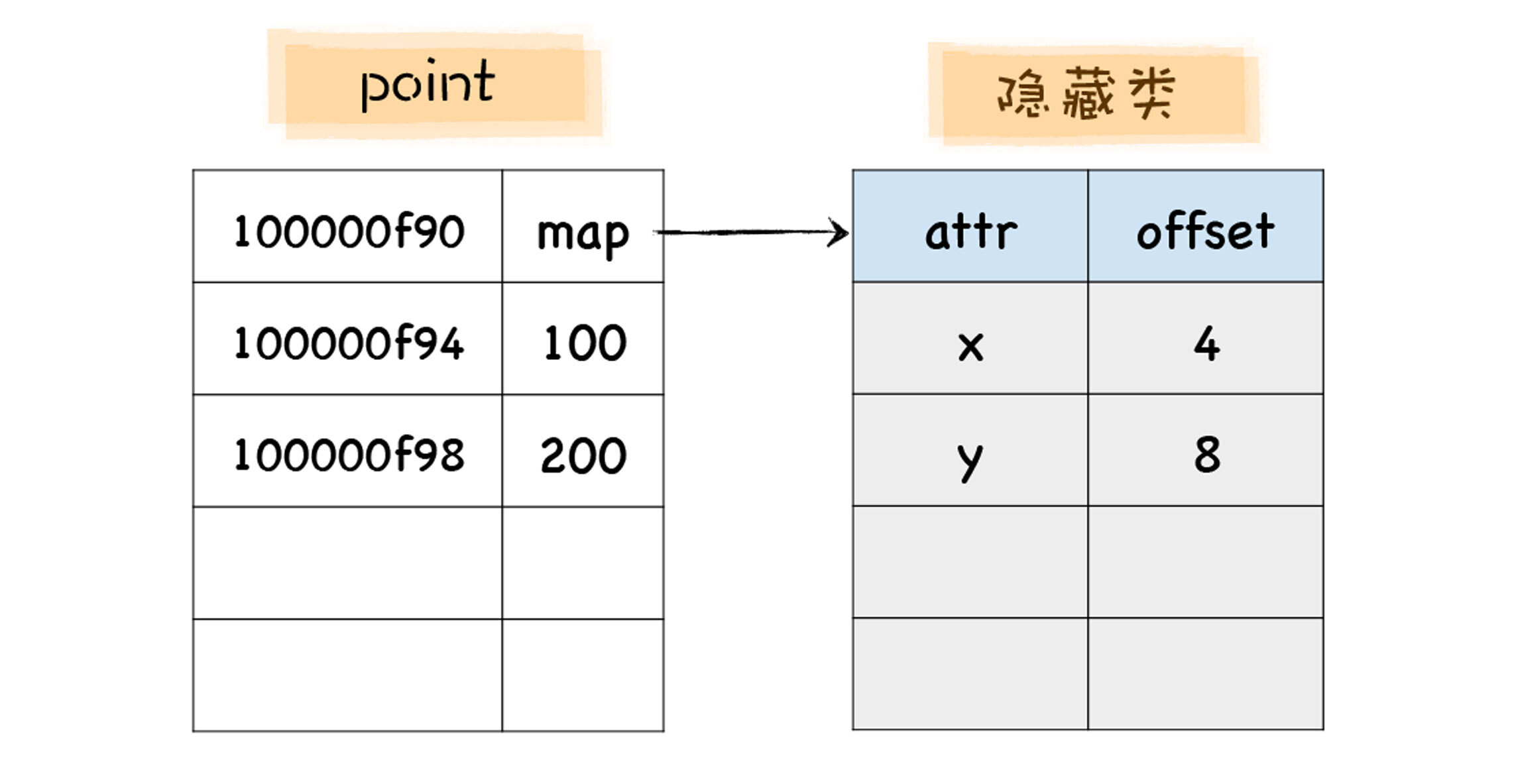 隐藏类描述了对象的属性布局,它主要包括了属性名称和每个属性所对应的偏移量,比如point对象的隐藏类就包括了x和y属性,x的偏移量是4,y的偏移量是8。