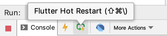 关于Flutter热重载的原理以及限制原因,我会在后面“34 | Hot Reload是怎么做到的?”文章,和你详细分析。现在,你只需要知道,如果热重载不起作用的时候,我们也不需要进行漫长的重新编译加载等待,只要点击位于工程面板左下角的热重启(Hot Restart)按钮就可以以秒级的速度进行代码重编译以及程序重启了,而它与热重载的区别只是因为重启丢失了当前程序的运行状态而已,对实际调试也没什么影响。