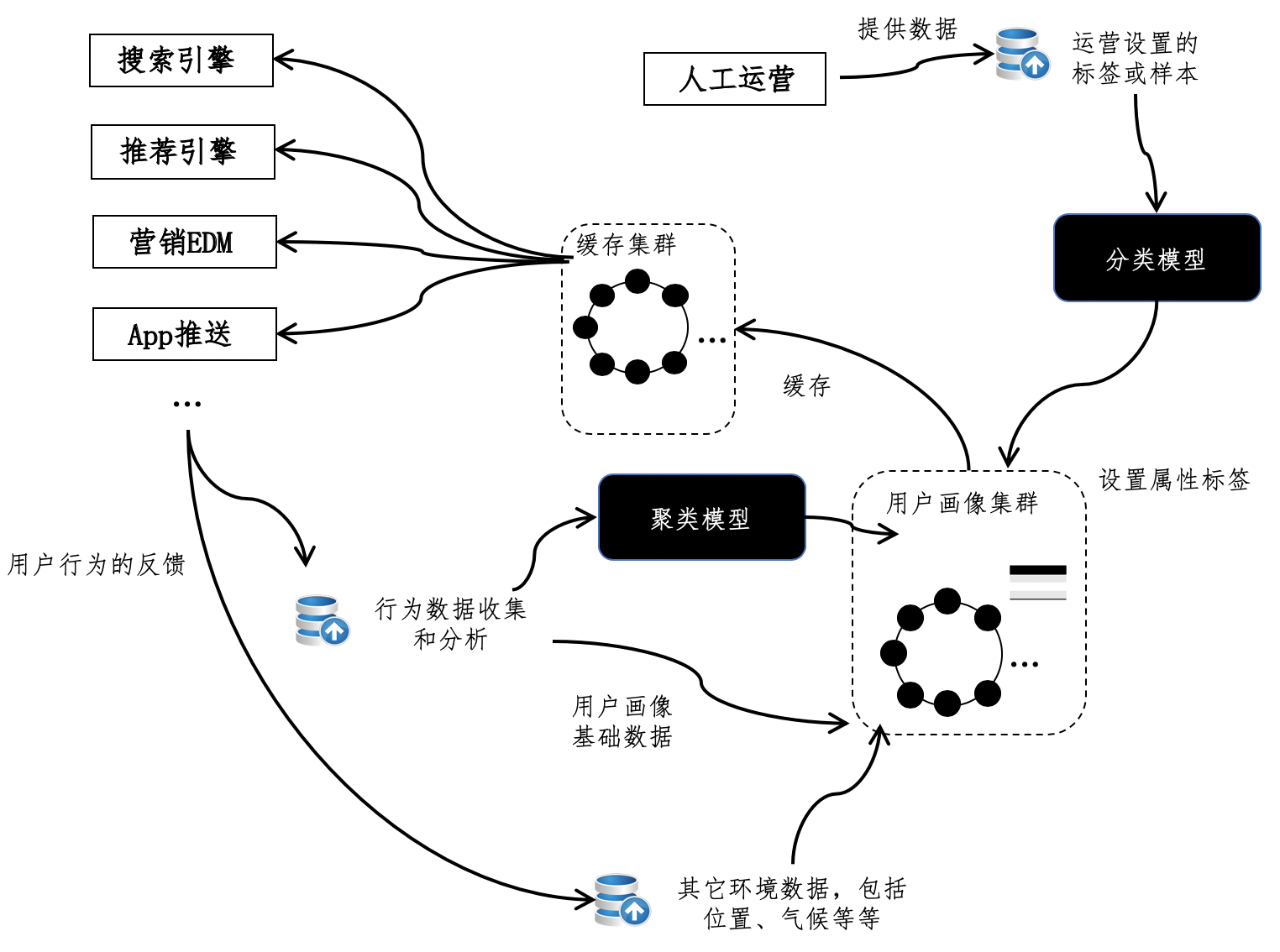 这种架构包括行为数据的收集和分析、聚类、分类、构建画像、缓存等几个主要模块。随着数据规模的不断扩大,我们可以选择一些分布式系统来存储用户画像数据,并使用缓存系统来提升数据查询的效率,为前端的搜索、推荐、EDM和App推送等应用提供服务。当然,我们还可以利用行为数据的跟踪,进一步分析这套画像系统的质量和效果,形成一个螺旋式上升的优化闭环。