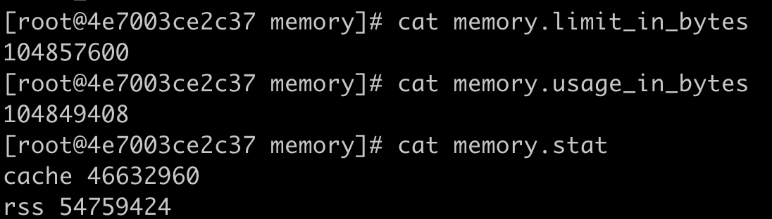 把容器启动起来后,我们查看一下容器的Memory Cgroup下的memory.limit_in_bytes和memory.usage_in_bytes这两个值。