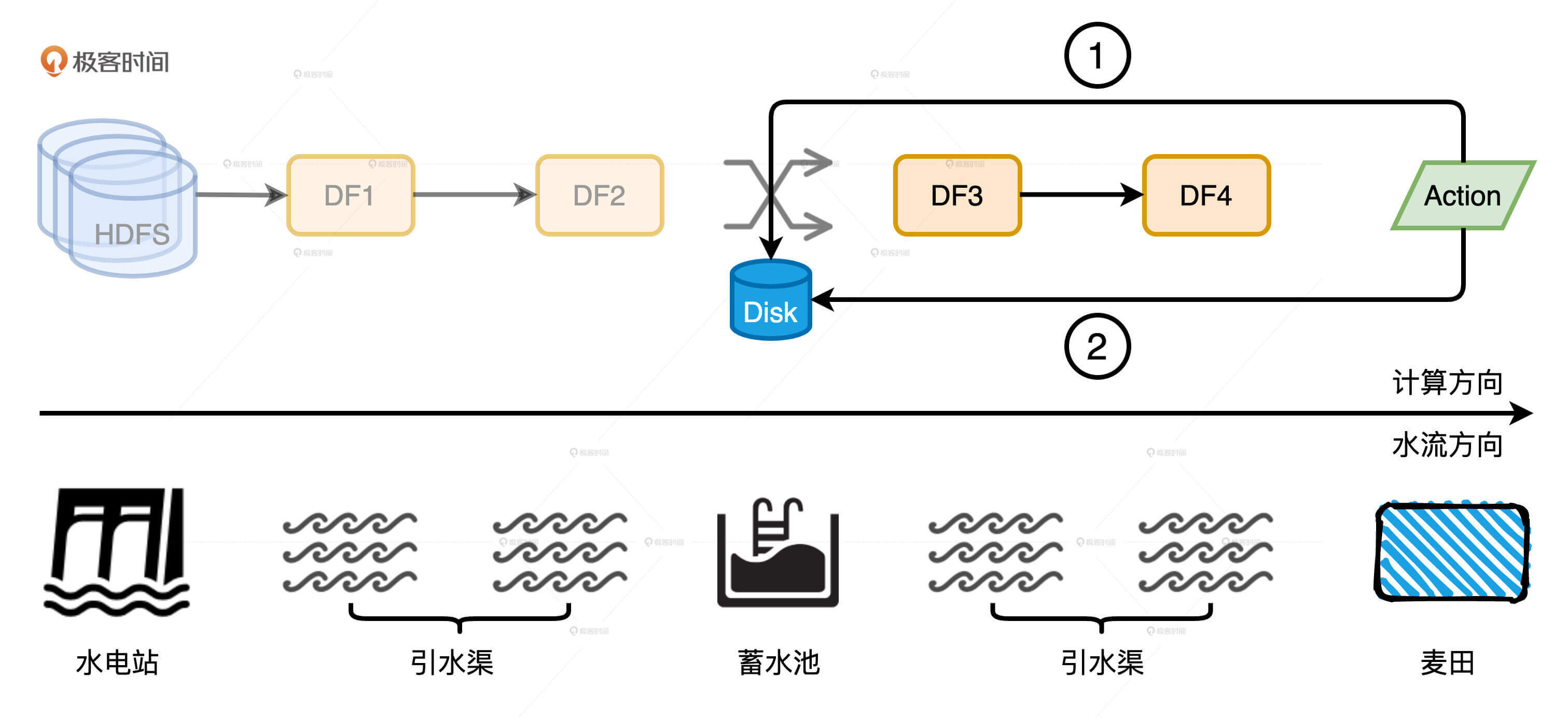 一个水电站往往服务方圆百里大大小小的村子,如果每次灌溉都等着水电站开闸放水,遇上大旱的年头,水还没流到支渠,麦苗就都旱死了。要是能沿着干渠,每隔一段距离就修建一座蓄水池,那么附近的村民就能就近灌溉了。在这个干渠灌溉的类比中,水电站的水是HDFS数据源头,蓄水池就是Shuffle中间文件,就近取水、就近灌溉就是磁盘复用机制。