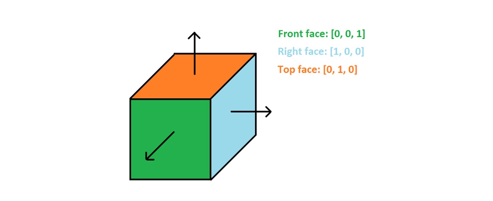 为什么这张纹理图片是偏蓝色调的呢?实际上,这张纹理图片保存的是几何体表面的每个像素的法向量数据。我们知道,正常情况下,光滑立方体每个面的法向量是固定的,如下图所示: