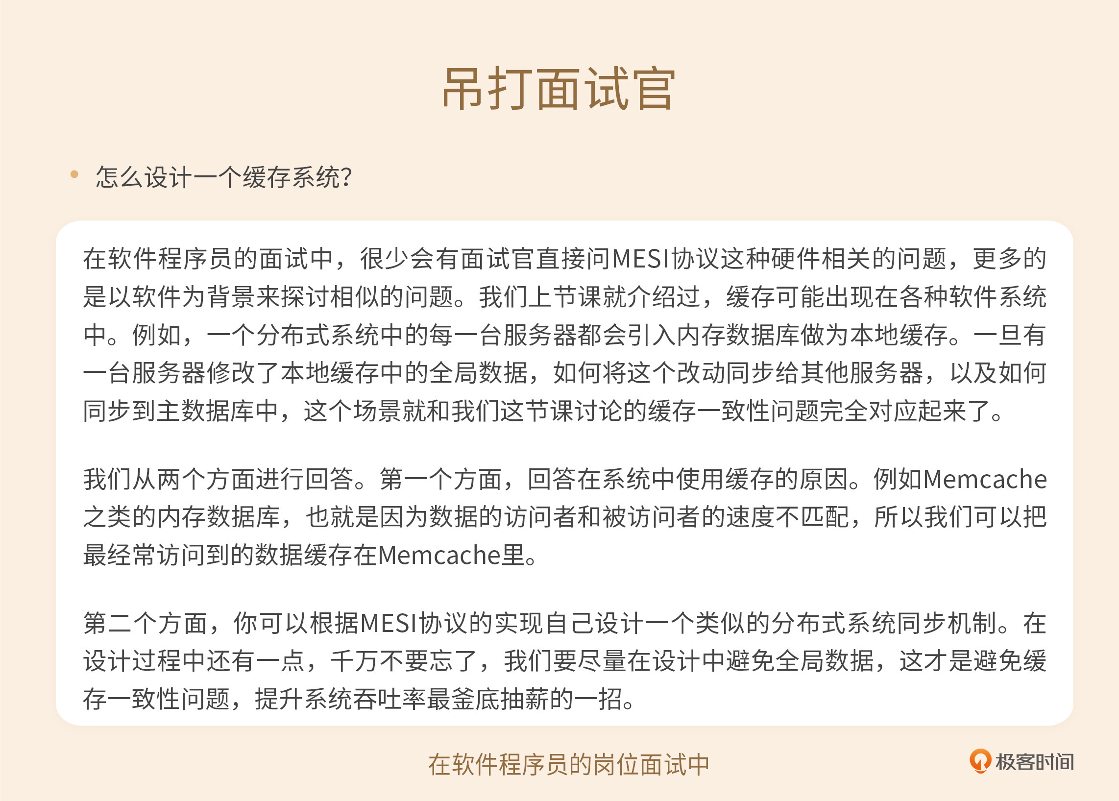 你能列举一下在工作中,你还遇到哪些场景需要类似的一致性算法的吗?(小提示:所有类似的有一致性需求的场景,都可以采用类似MESI协议的做法来解决)。欢迎你在留言区分享你的想法和收获,我在留言区等你。