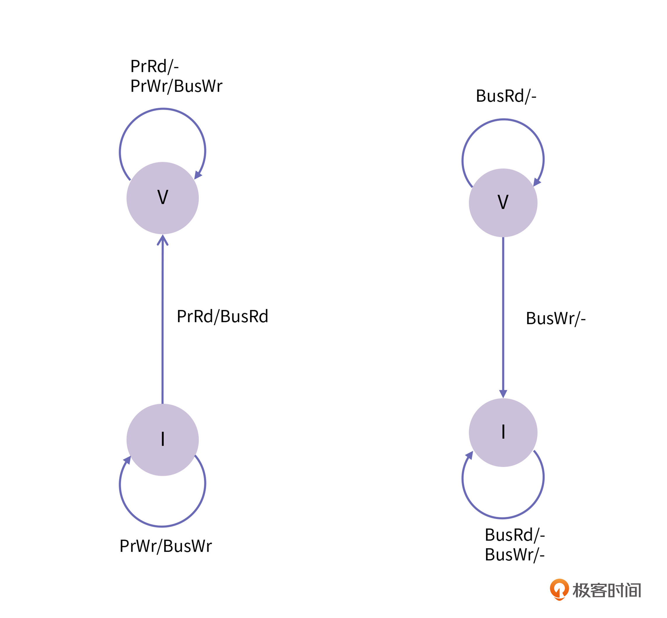 接下来我们看图的右边,这部分代表总线发起的请求。我们还是分别讨论状态I和状态V。先讨论状态I,所有侦听到的BusRd和BusWr都不会影响它,保持无效,所以这种情况被忽略。