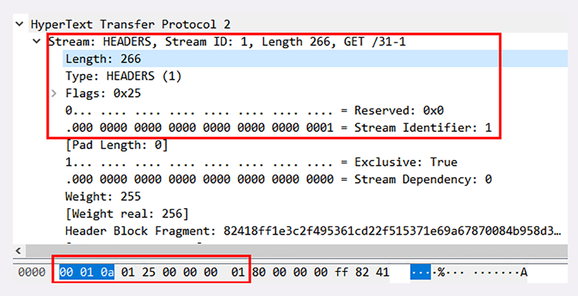最后4个字节的流标识符是整数1,表示这是客户端发起的第一个流,后面的响应数据帧也会是这个ID,也就是说在stream[1]里完成这个请求响应。