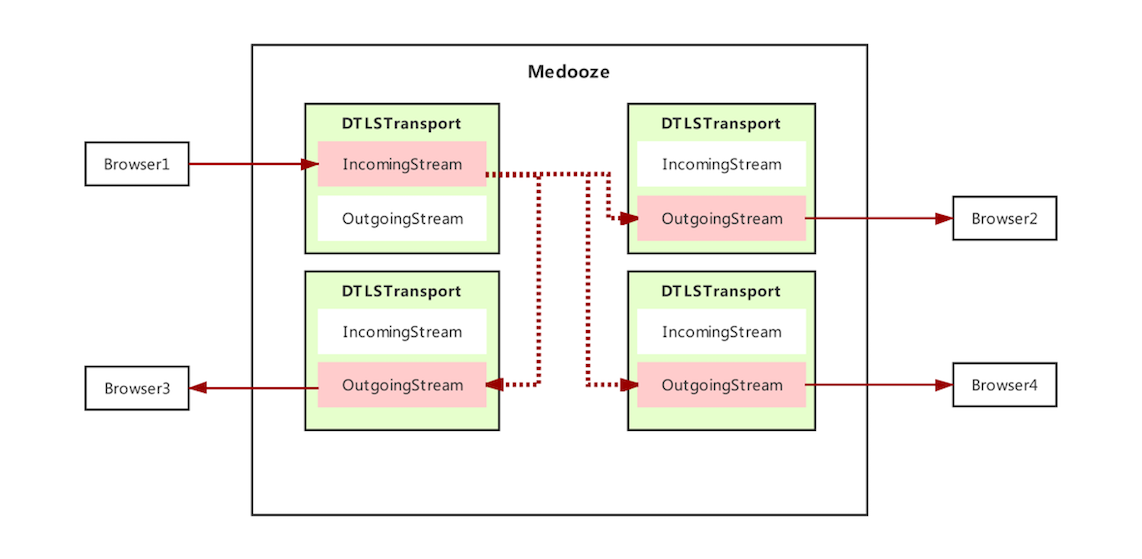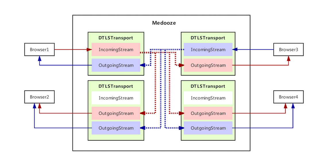 - 然后,Medooze 再将此流分发给 Browser 2、Browser 3、Browser 4 的 OutgoingStream。