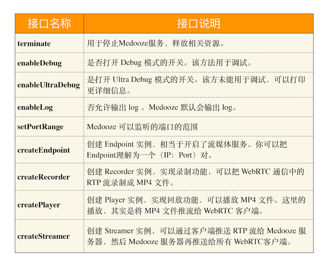如果你对JavaScript 非常精通的话,你可能会觉得这几个接口实在太简单了,但Medooze 设计这些接口的理念就是尽量简单,这也符合我们定义接口的原则。对于这些接口的使用我们会在后面的文章中做讲解,现在你只需要知道这几个接口的作用是什么就好了。