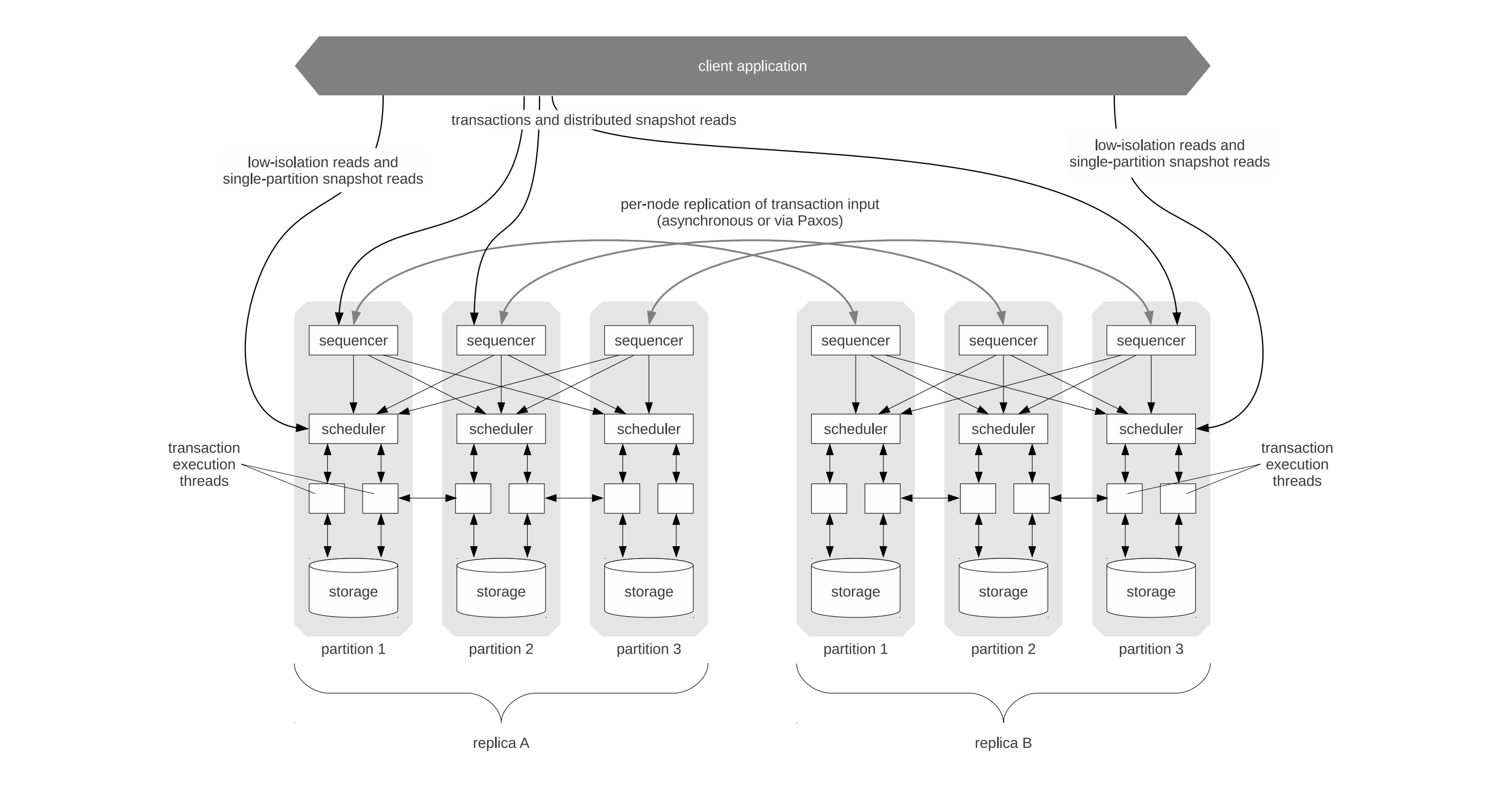 对于FaunaDB,可能了解的人更少些。它是一款商业数据库,从NoSQL逐渐过渡成为分布式数据库。FaunaDB的理论原型是Calvin,它和Spanner一样在2012年发表了原型论文,被SIGMOD收录。虽然它们的目标都是提供强一致性的分布式关系型数据库,但设计思路截然不同。