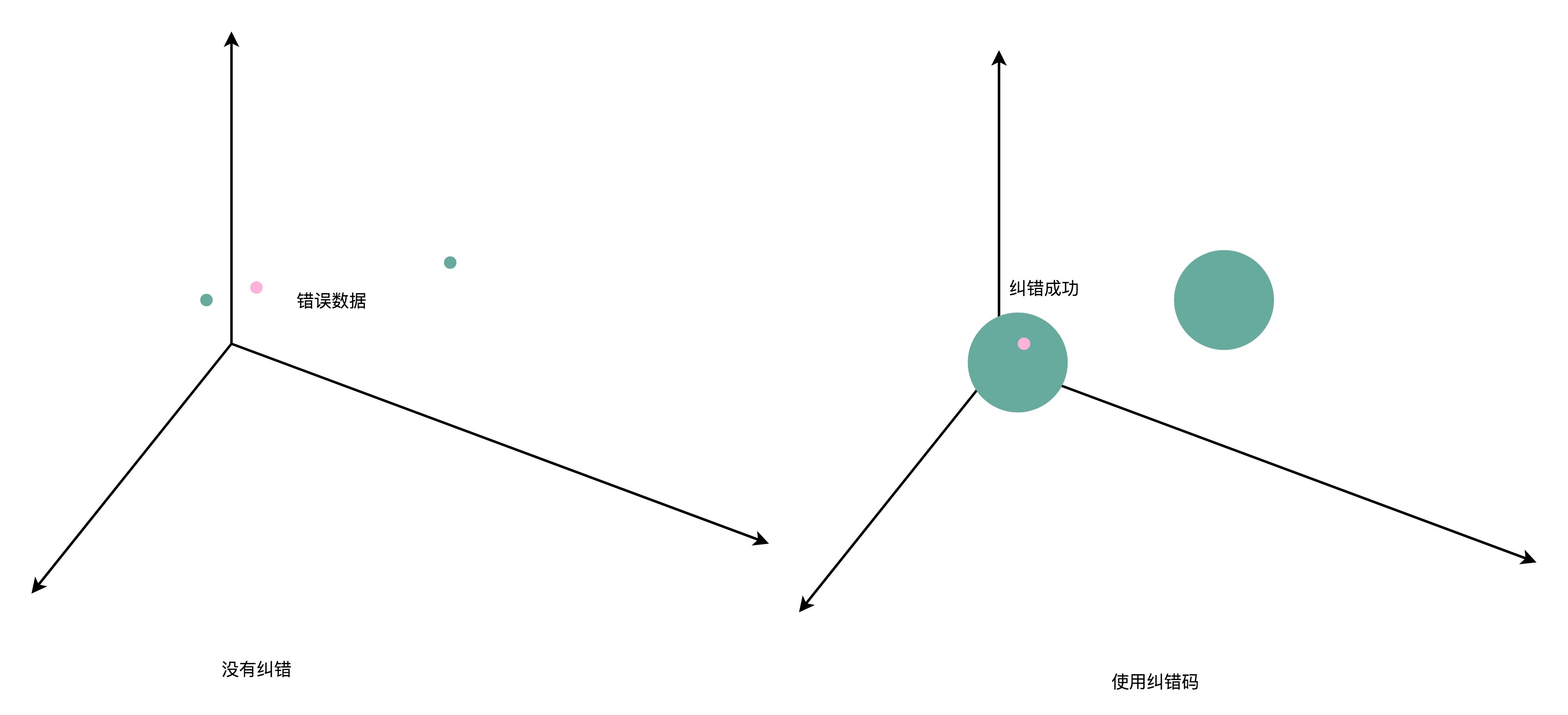 在引入了海明距离之后,我们就可以更形象地理解纠错码了。在没有纠错功能的情况下,我们看到的数据就好像是空间里面的一个一个点。这个时候,我们可以让数据之间的距离很紧凑,但是如果这些点的坐标稍稍有错,我们就可能搞错是哪一个点。