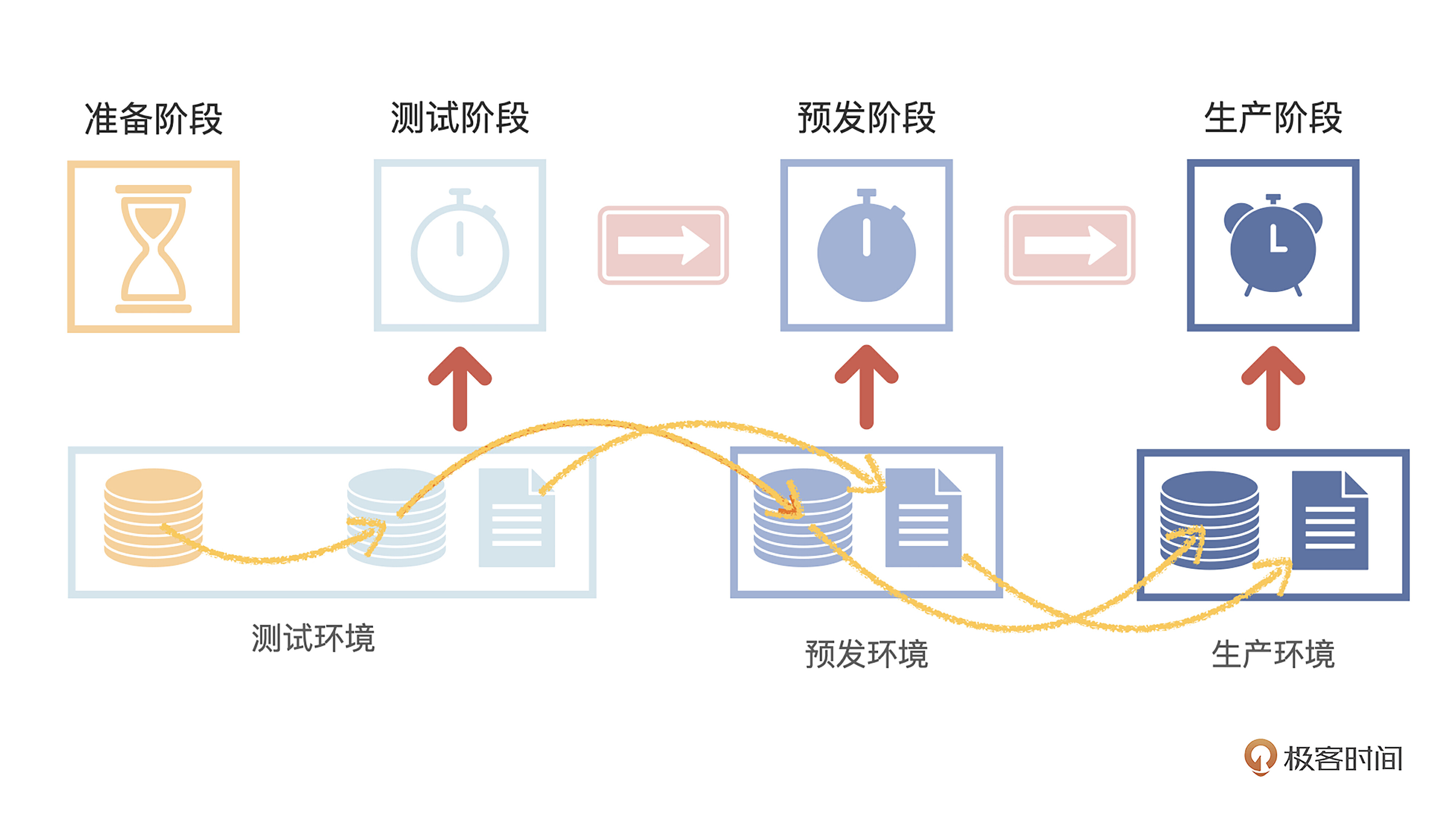 基于上面提到的三个流程节点,对应的环境就是测试环境、预发环境和生产环境。这里的“环境”概念,可以是独立的服务器、独立的数据库,也可以是独立的代码执行逻辑等等,没有统一的说法,核心是要隔离所有功能操作,避免流程之间的干扰。